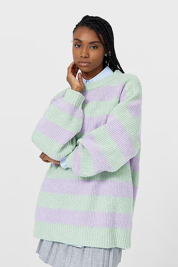 Lo nuevo de Stradivarius apuesta todo al color y ha traído prendas muy llamativas con las que dar vida a tus outfits del día a día. Además de lentejuelas y cuadros, ha sido el jersey de rayas el que se ha llevado todo el protagonismo. Se trata de un jersey de punto de manga larga, cuello redondo y corte oversized que está disponible en dos combinaciones ideales: lila y naranja y malva y verde pastel.