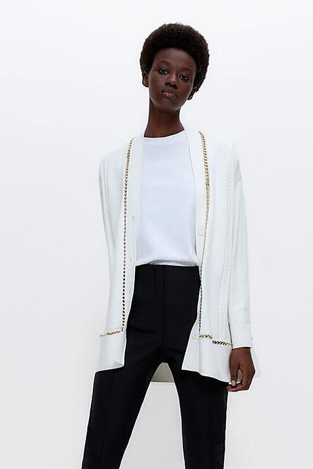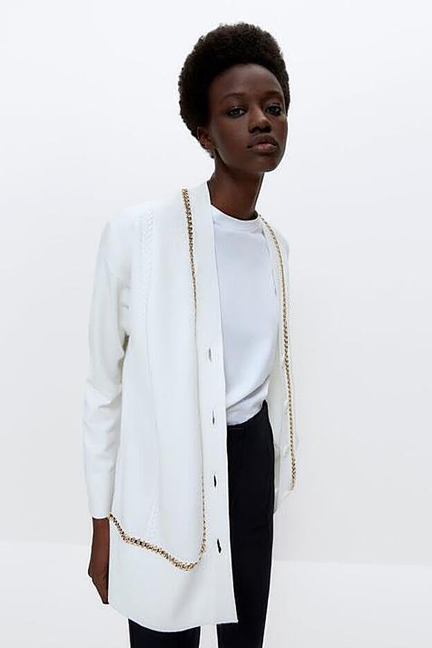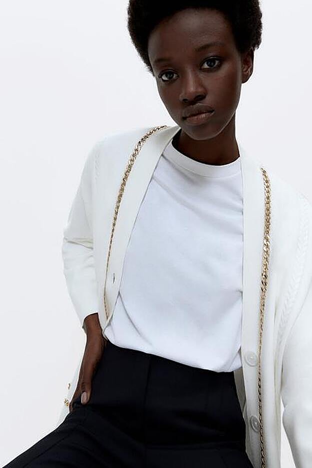 La propuesta en color blanco de Uterqüe viene con detalle de cadena en dorado a lo largo de toda la prenda. Confeccionada en punto, con escote de pico y manga larga, tiene el cierre de frontal con botones a tono.