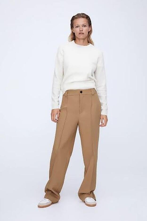 Un modelo ideal que ya hemos buscado en la web y... ¡Sí, lo hemos encontrado! Zara tiene a la venta diferentes pantalones de ese estilo y en colores similares, pero el de Nagore se diferencia por un talle alto muy estilizador y que lleva el botón negro a contraste. Es de pernera recta y lleva como detalle característico las costuras marcadas. Cuesta 29,95 euros, pero hay una mala noticia: está agotado en las tallas XS, S y M. Si vistes alguna de esas, tranquila, porque es probable que lo encuentres en tienda.