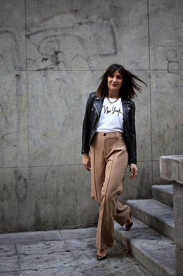 Además, estamos muy a favor de cómo los ha combinado. Nagore añadió prendas más casual y relajadas para dar un toque más desenfadado al look y que sea más ponible en el día a día. Escogió una camiseta blanca con letras negras y una biker cropped de efecto piel también negra. Dos prendas que también son de Zara y que completó con unos stilettos a juego.