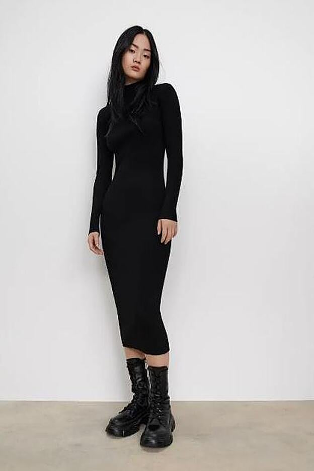 Zara tiene un modelo más para el día a día y muy calentito con el cuello vuelto. Un vestido también midi, ajustado y de manga larga con hombreras marcadas que cuesta 29,95 euros.