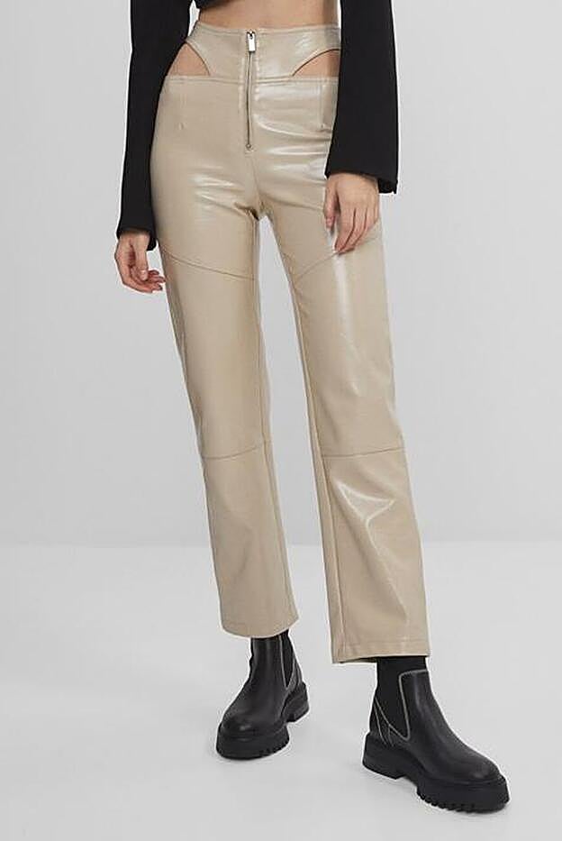 Se trata de unos pantalones en color beige claro de vinilo. Ya solo el tejido hacen que sea una prenda complicada que se sale fuera de lo normal y que muy pocas se atreverían a poner. Sin embargo, no ese efecto acharolado lo que hacen que estos pantalones de Bershka sean los más atrevidos, sino su diseño. Porque además de ser de talle alto y de pernera recta -hasta ahí todo bien-, llevan unas aberturas en las caderas que dejan al aire esa zona.