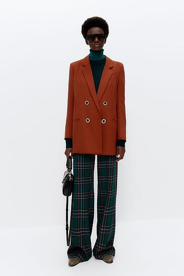 La sastrería masculina declinada en versión oversize es otra aproximación triunfal esta temporada en lo que a inspiración retro se refiere. Uterqüe apuesta por una blazer cruzada en tono teja con botones lacados y grandes hombreras combinados con un par de pantalones rector con estampado de cuadros escoceses. Un jersey de cuello vuelto es el detalle definitivo para redondear este giro dandy.
