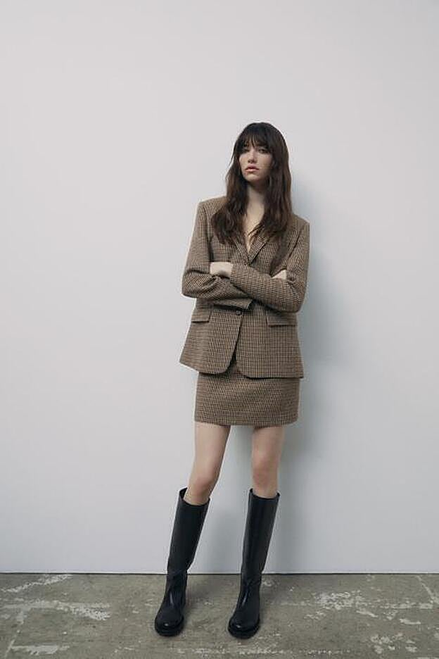 El dos piezas clasico feminiza sus formas gracias a cambiar el pantalón por una minifalda recta. Estampadas en cuadro príncipe de gales y con un patrón oversize, este modelo de Zara es un claro homenaje al Swinging London. La blazer cuesta 69,95 euros y la minifalda, 25,95 euros.