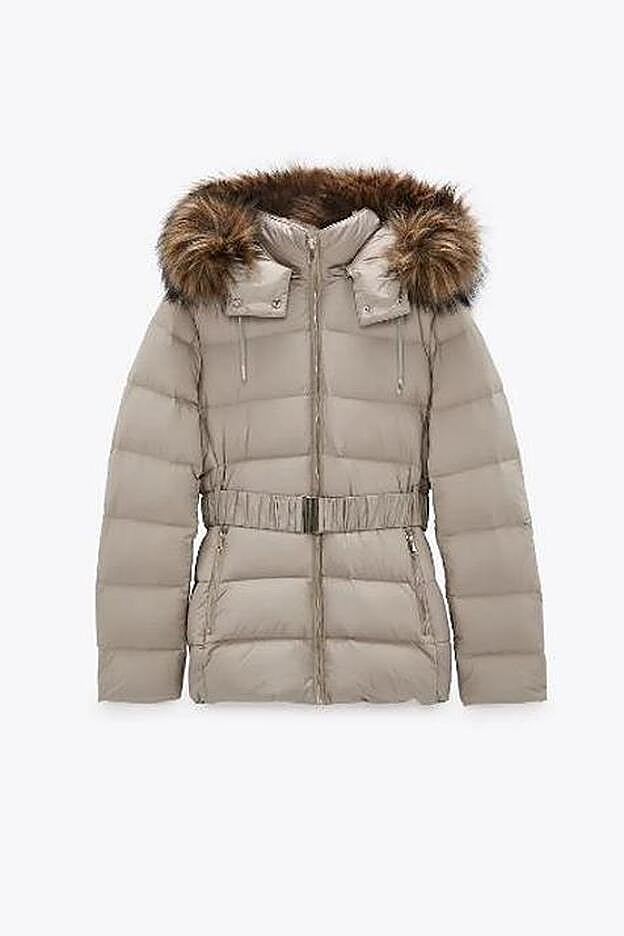 Se trata de dos modelos de plumíferos diferentes. El primero es uno corto para las que buscan algo menos abrigado y diferente. Un diseño beige con un toque metalizado que está relleno de pluma y plumón y que su característica principal es que es resistente al agua. Tiene el cuello subido y lleva una capucha que se puede desmontar con aplicación de efecto pelo. Perfecto para las que buscan salir del negro y prefieren tonos más claros, pero igual de ponibles. Está rebajado a 39,99 euros, pero está agotado en la mayoría de las tallas.
