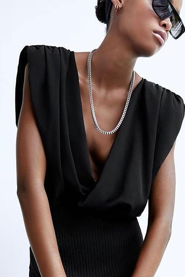 Un diseño cruzado de tirante ancho y escote en forma de pico con unos pliegues y hombreras ideales. Cuesta 22,95 euros y la colaboradora lo llevó sujeto para que no le quede tan holgado como indica la propuesta de la firma. Una prenda muy ponible que podrás reutilizar en varias ocasiones y en cualquier estación del año. Y no solo para un evento, sino también con, por ejemplo, unos jeans y zapatillas.