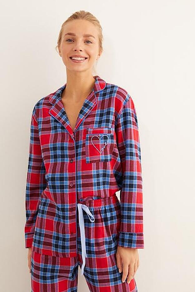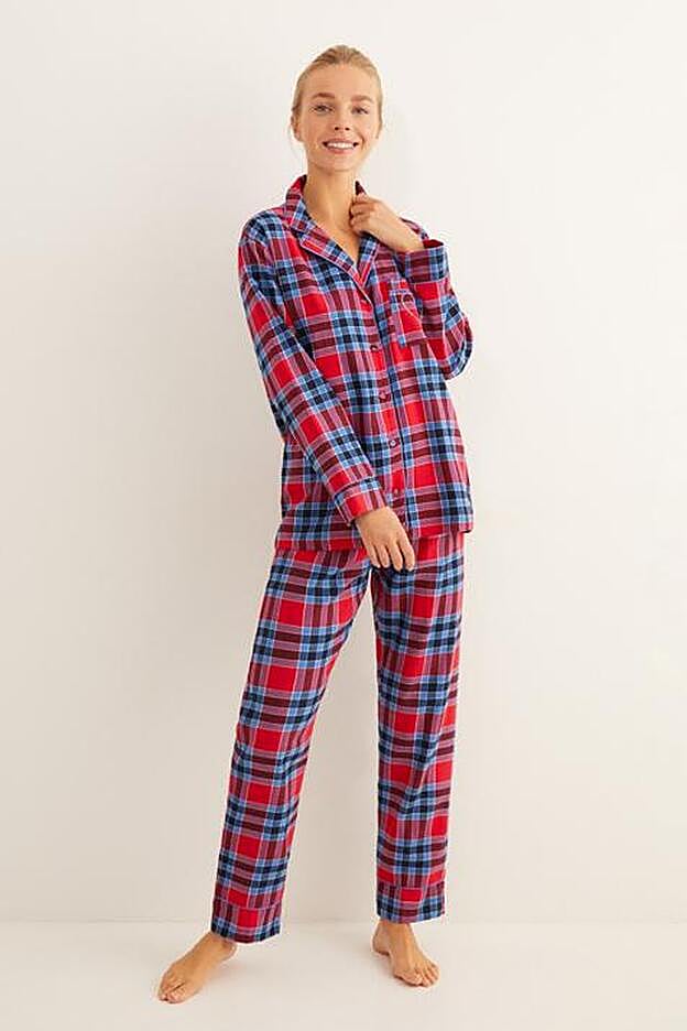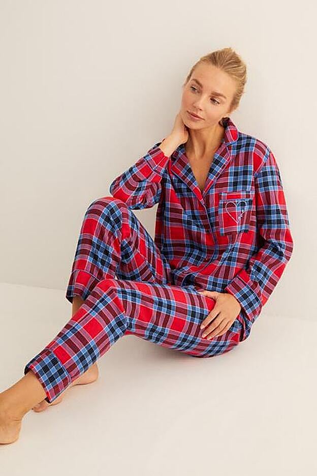 En rojo y azul, el pijama de cuadros de Ana Soria de diseño camisero es de Women Secret y está confeccionado en franela, el tejido más calentito y recomendable del invierno.