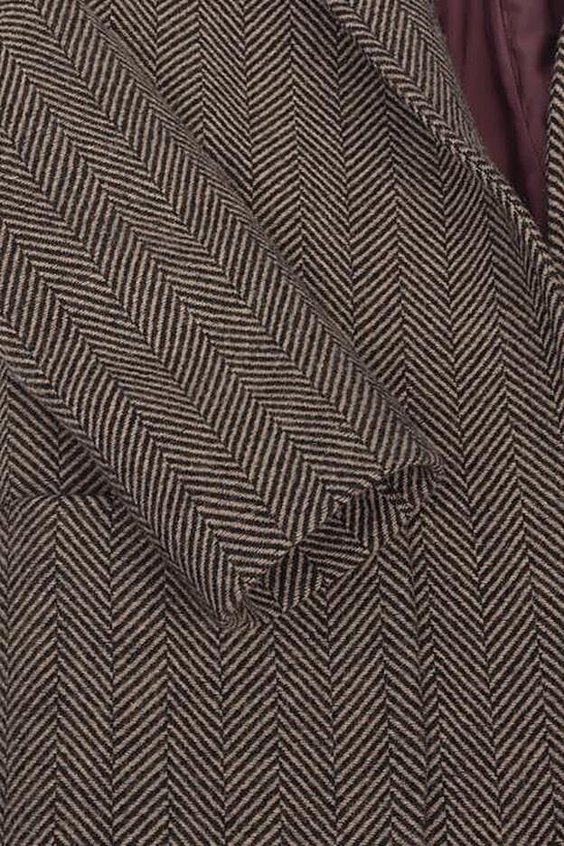 Confeccionado con lana de chevrón 100%, tiene cuello de solapa y dos bolsillos laterales de plastrón. Está disponible en color gris y también en tonos burdeos.