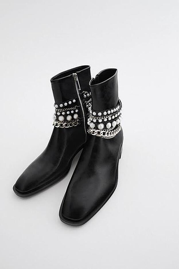 Terminamos con otro diseño super favorecedor: botines planos de piel con detalle de cadenas y perlas para subir el nivel del outfit. Perfectos para combinar con looks monocolor en negro o con estampados. Rebajados en la web de Zara de 55,95 euros a 29,99 euros.