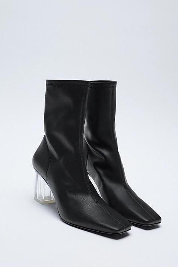 Seguimos con otra opción muy original: los botines negros con tacón de metacrilato y caña elástica para marcar tendencia con todos tus looks en 2021. 7 centímetros de pura comodidad gracias a su diseño cuadrado y a su plantilla técnica flexible compuesta de látex. ¿Su precio? Antes. 39,95 euros. Ahora: 22,99 euros.