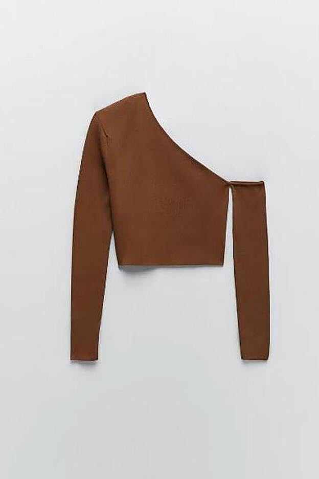 Un look que tenía como protagonista un top asimétrico de Zara. En concreto, un modelo en color marrón chocolate de punto y manga larga que cuesta 22,95 euros y que está disponible en tallas S, M y L. Es de corte justado y tenemos que reconocer que su diseño original nos parece eprfecto para llevarlo con unos pantalones negros.