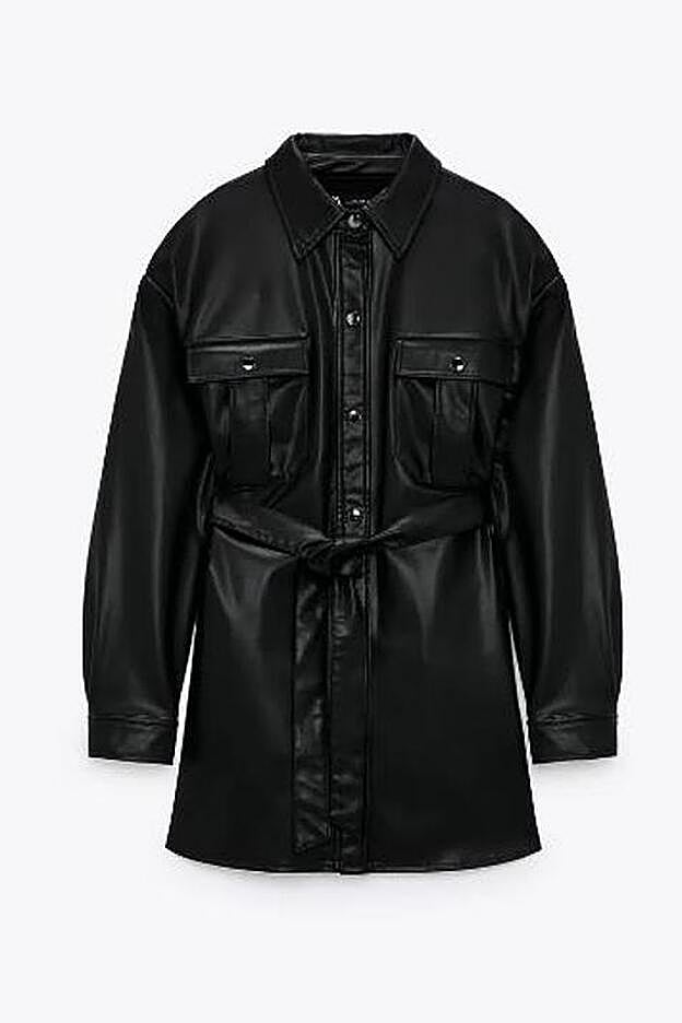 Y nos ha gustado tanto porque es diferente a lo que hemos visto normalmente. Se trata, como hemos dicho, de una camisa de tejido polipiel que imita al cuero negro y que lleva el cuello con solapas, cierre de botones metálicos y manga corta. Sí, has leído bien. Hasta ahora, todas las prendas de este estilo llevaban la manga larga, sin embargo la de Alba es corta. Ideal, ¿verdad? Además, lleva un cinturón forrado a juego para ajustar la prenda a la cintura y marcar así la silueta.