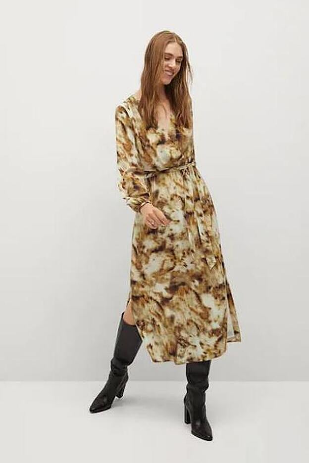 El estampado del vestido nos pareció ideal y en Mango también tienen ese efecto degradado, pero en tonos marrones, con un vestido también largo que ahora está rebajado a 44,99 euros. Aunque siempre puedes probar con cualquier modelo largo de, por ejemplo, un estampado floral.