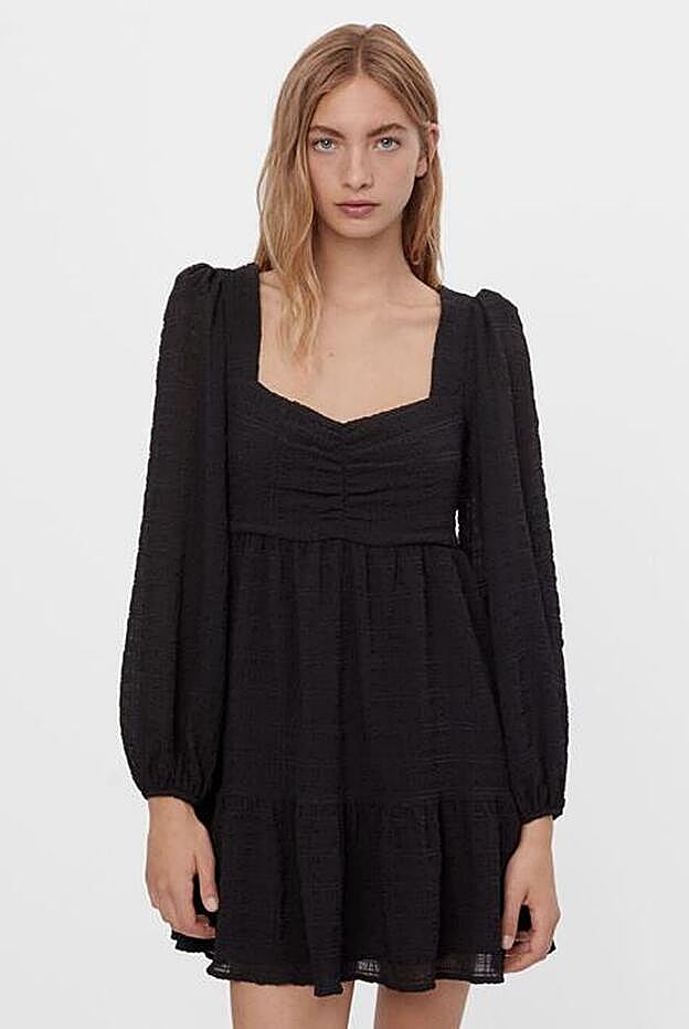 Aprovechar las rebajas para hacer con básicos que puedes usar año tras año y siempre ir perfecta es la mejor opción. Y un vestido negro es la prenda comodín de un cualquier armario. Si tienes que hacerte con uno o renovar el que ya tengas, este corto, de manga larga y mangas abullonadas es perfecto. Costaba 25,99 y ahora cuesta 15,99 euros (cómpralo aquí).