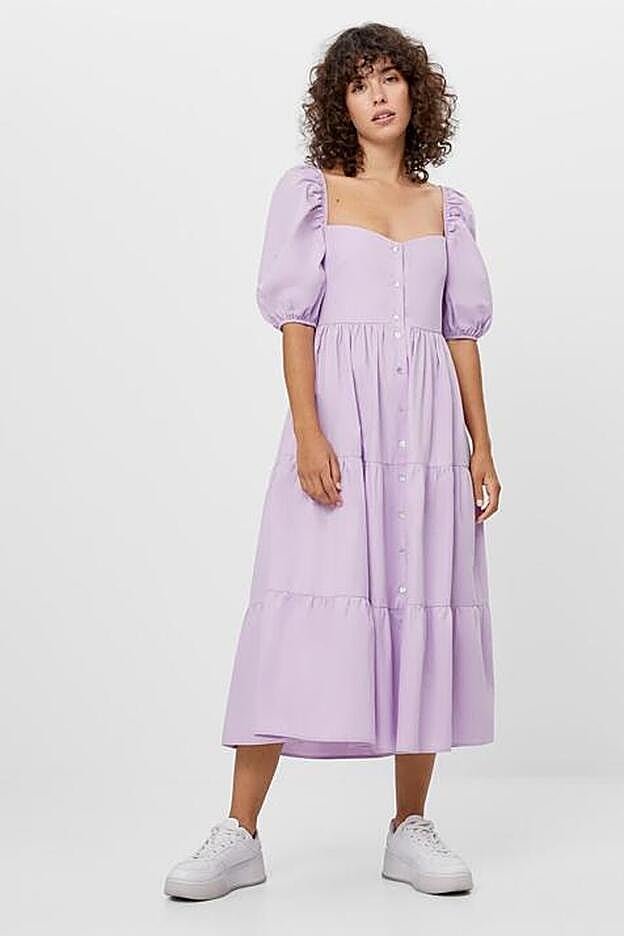 El lila fue uno de los colores protagonistas del 2020 y no tiene porqué dejarlo de ser en 2021. Aunque la nieve y el frío está acechando el país, la mirada ya la tenemos puesta en la primavera y los colores pasteles son más que bienvenidos. Apostar por un vestido midi como es tipo camisero con volantes, que puedas combinar con zapatillas y botas para el día a día es todo un acierto. Tiene el escote corazón, las mangas abullonadas y costaba 29,99 euros y ahora lo puedes comprar aquí por 15,99 euros. ¡Chollazo!