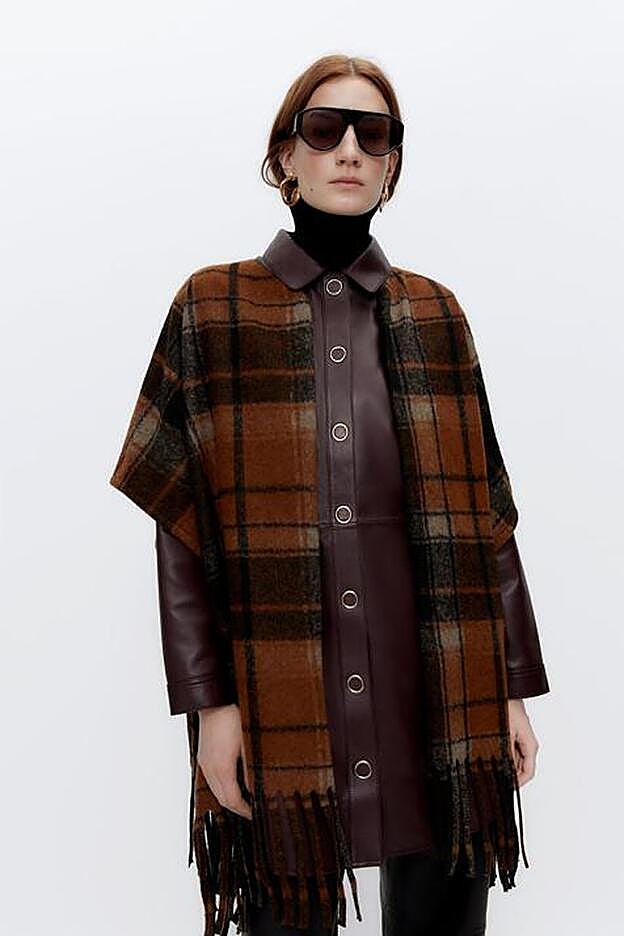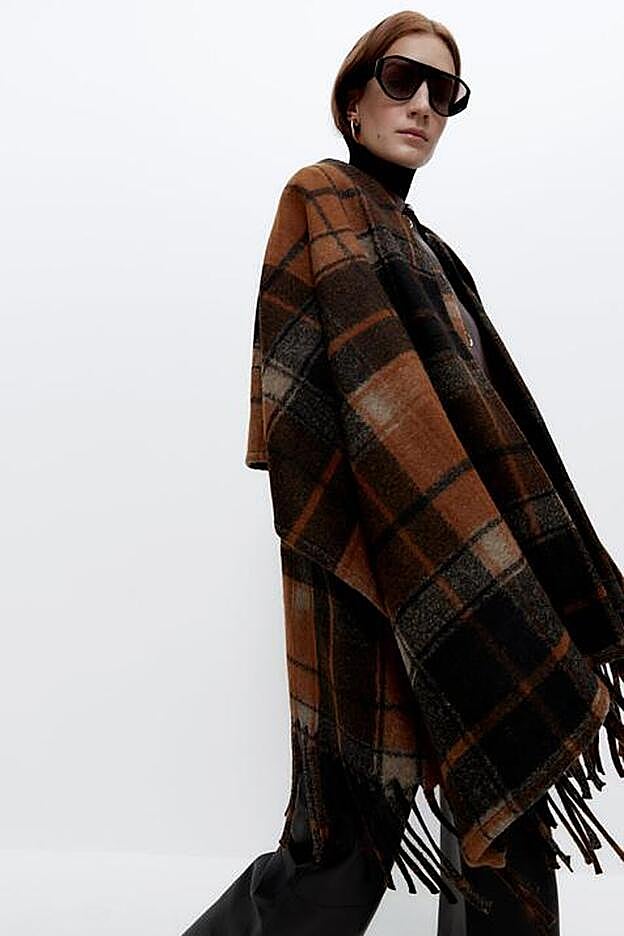En color marrón con cuadros en negro y gris, esta capa bufanda de Uterqüe tiene un precio de 99 euros y se ha lanzado en una única talla, la M.