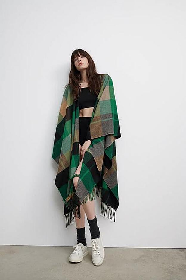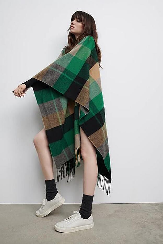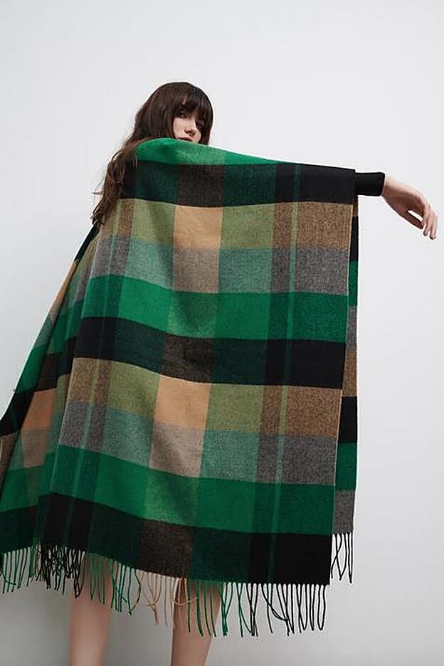 En Zara han lanzado una prenda similar, que podemos utilizar como capa o como bufanda pero han apostado por el verde como color estrella. Tiene estampado de cuadros en negro y beige, con escote de pico y bajo acabado en flecos.