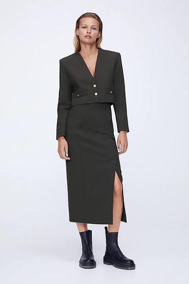 Se trata, según la firma de Inditex, de un cuerpo con escote a pico en color gris antracita, manga larga con hombreras, falsos bolsillos delanteros y cierre frontal con botones metálicos. Un diseño creado específicamente para resaltar cualquier figura al elevar visualmente los hombros y afinar la cintura por su corte cropped. Perfecto para combinar con pantalones de tiro alto e incluso con vaqueros o faldas en looks de noche o para triunfar dentro de la oficina con un jersey de cuello cisne.