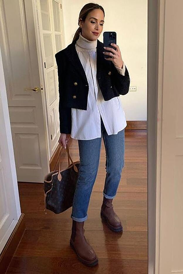 La diseñadora sevillana añadió una camisa de corte oversized blanca en color blanco de Stradivarius consiguiendo una combinación perfecta. Completó el look con una blazer cropped también de Zara y casi tan bonita como la rebajadísima de Tamara Falcó. Unos pantalones vaqueros pitillo y unos botines marrones confirmaban este outfit al que le damos un diez.