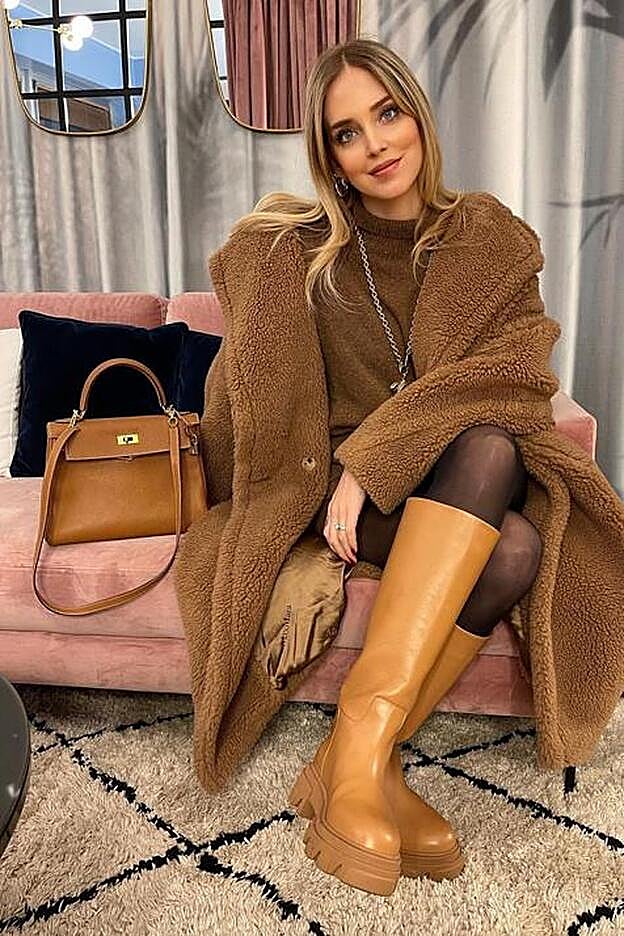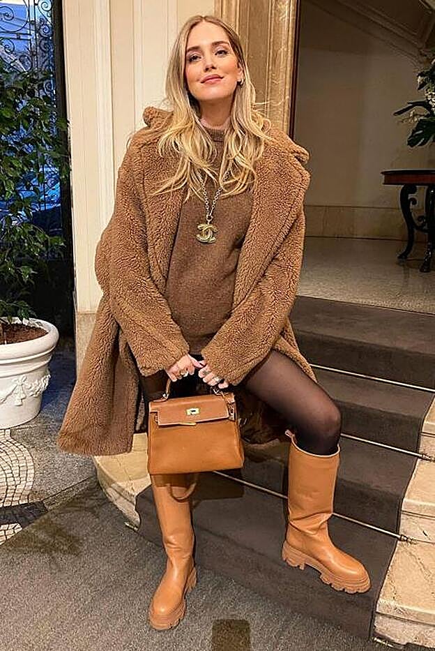 Chiara Ferragni publicó un look muy abrigadito para estos días de frío protagonizado por un conjunto de punto en color marrón formado por shorts y un jersey de corte oversized. Un look que acompañó con medias a juego, un abrigo largo de borreguito tipo 'teddy' en color camel, un bolso y las mencionadas botas de Zara a juego.
