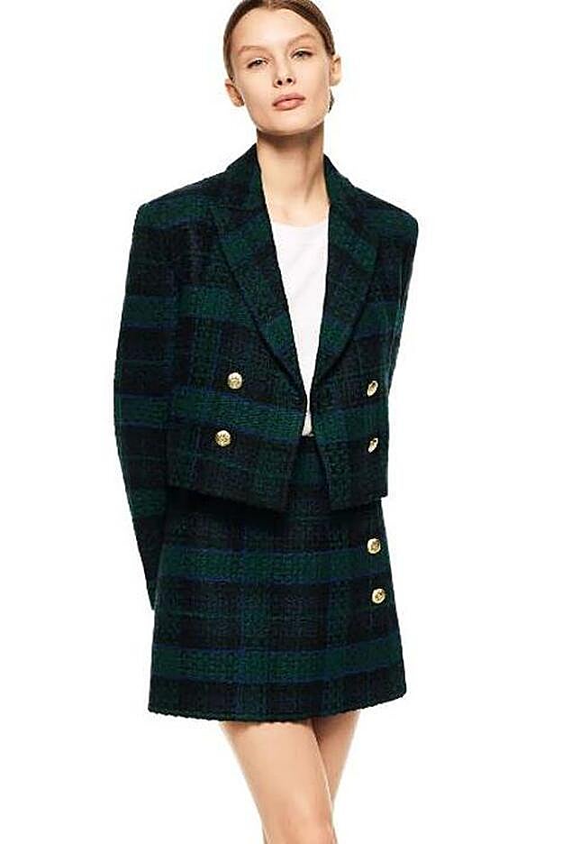 Se trata de una combinación de falda y blazer de cuadros en color verde botella y azul tipo colegiala que es ideal para triunfar con tus looks de oficina -o de lo que sea-. Te explicamos por qué. La falda es un modelo mini de talle alto que lleva unos botones joya dorados en el lateral. Cuesta 29,95 euros y está disponible desde la talla XS a la XL. Este tipo de faldas son perfectas para el invierno porque, junto con botas altas y medias, no pasarás frío e irás ideal.