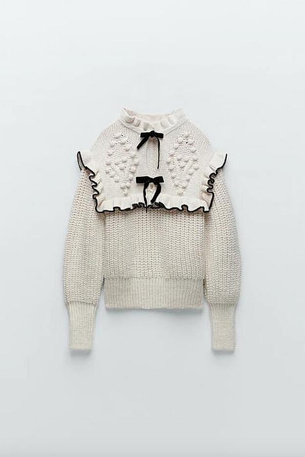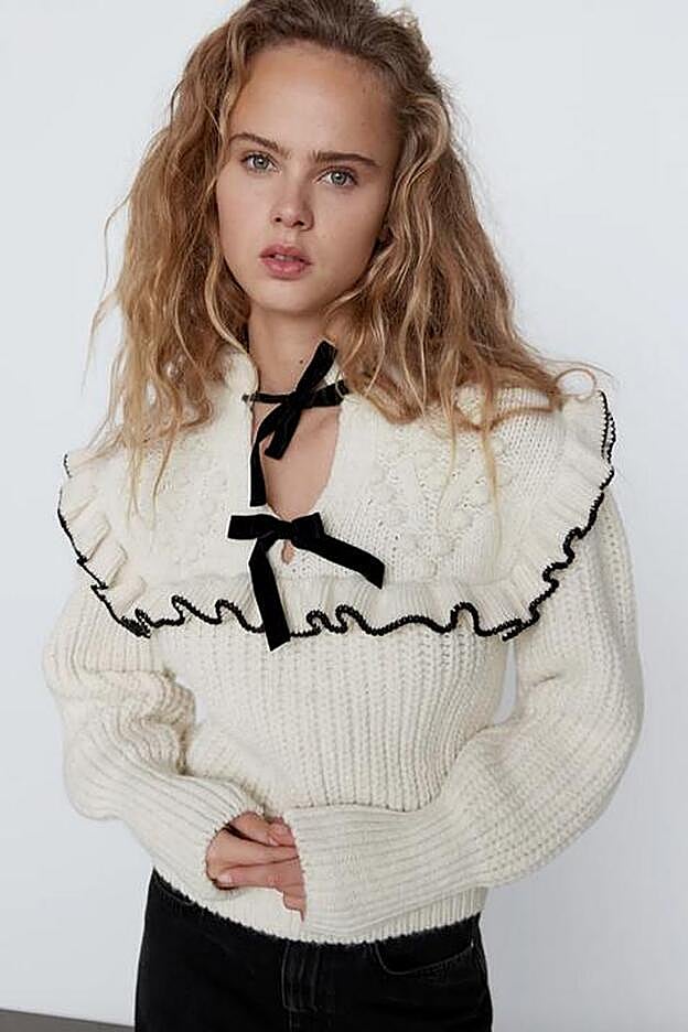 Con mangas abullonadas acabadas en puño, este jersey viene con volantes en delantero y hombros acabadas en contraste. Tiene un precio de 29,95 euros y está disponible en las tallas S, M y L.
