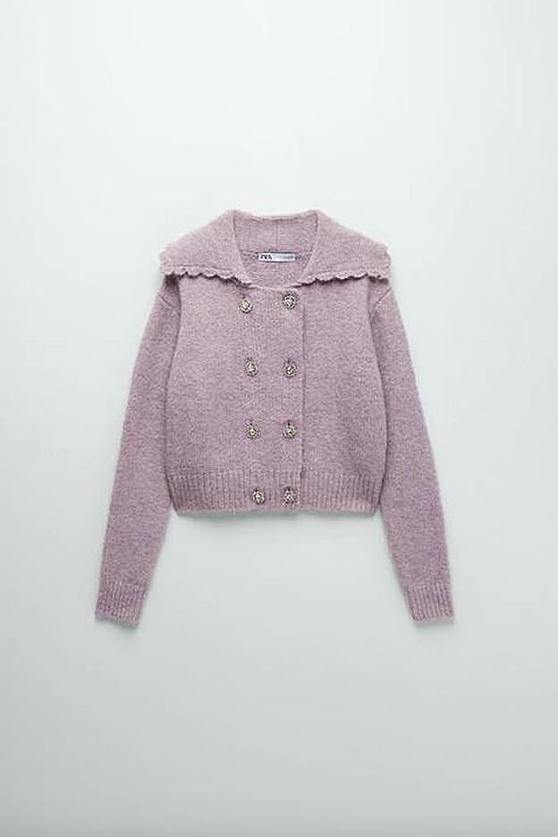 La chaqueta de punto en color lila, que acaba de llegar al catálogo de Zara, también se ganó nuestro corazón gracias a su cierre de botones joya y su cuello de solapa.