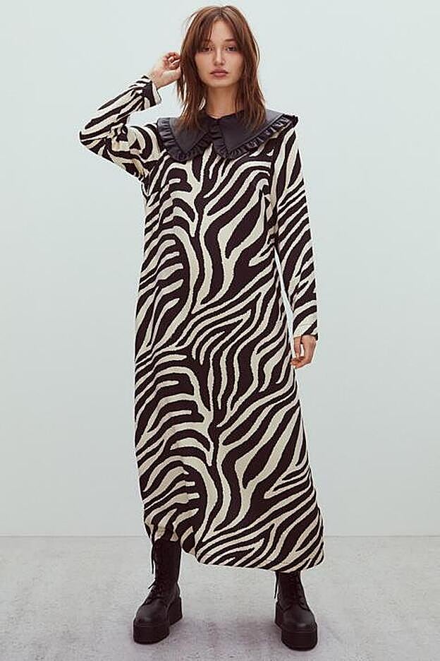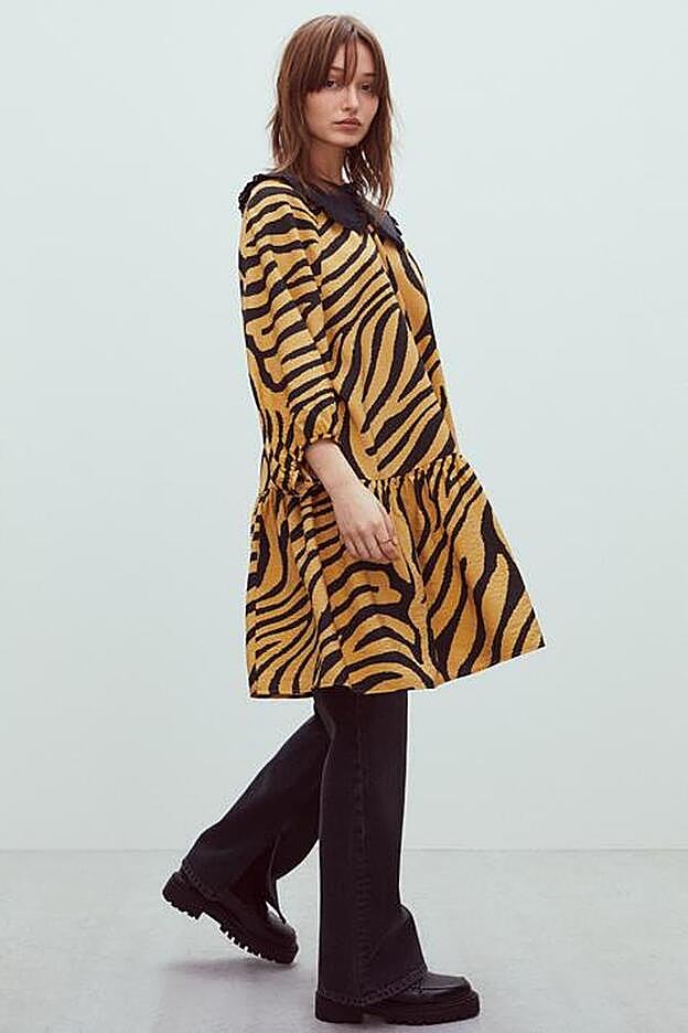 Por ejemplo, este vestido baby doll con un animal print atigrado. Se presta a que lo uses como camisola o que lo lleves con medias, ese cuello bobo de la imagen (que va aparte) y merceditas. Cuesta 19,99 euros y puedes encontrarlo desde la XS a la XXL.