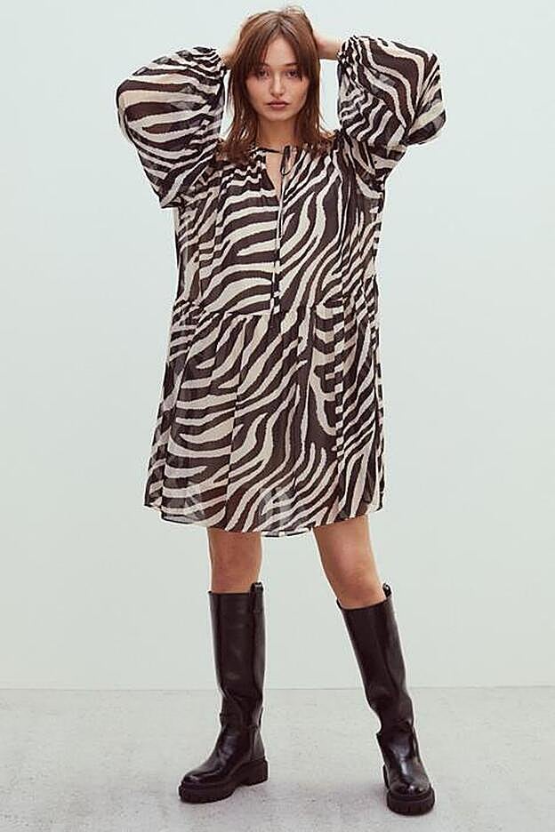 Otra propuesta es un vestido corto de gasa muy fluido, con manga globo larga y escote en V cerrado con lazada. Lo encuentras en dos versiones, estampado de cebra y de leopardo, ambos disponibles desde la XS a la XXL por 24,99 euros.