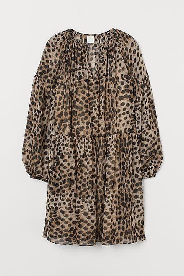 Acabamos con otro diseño ultra vaporoso, un vestido XXL de manga abullonada y tejido de gasa con estampado atigrado en tonos pardos y amarillos. Disponible de la XS a la XXL, su precio es de 39,99 euros.