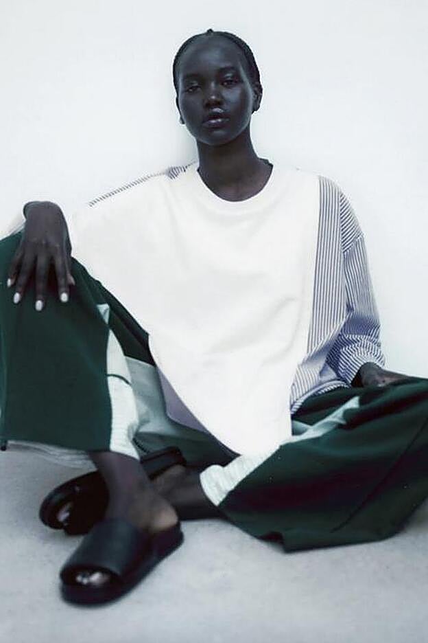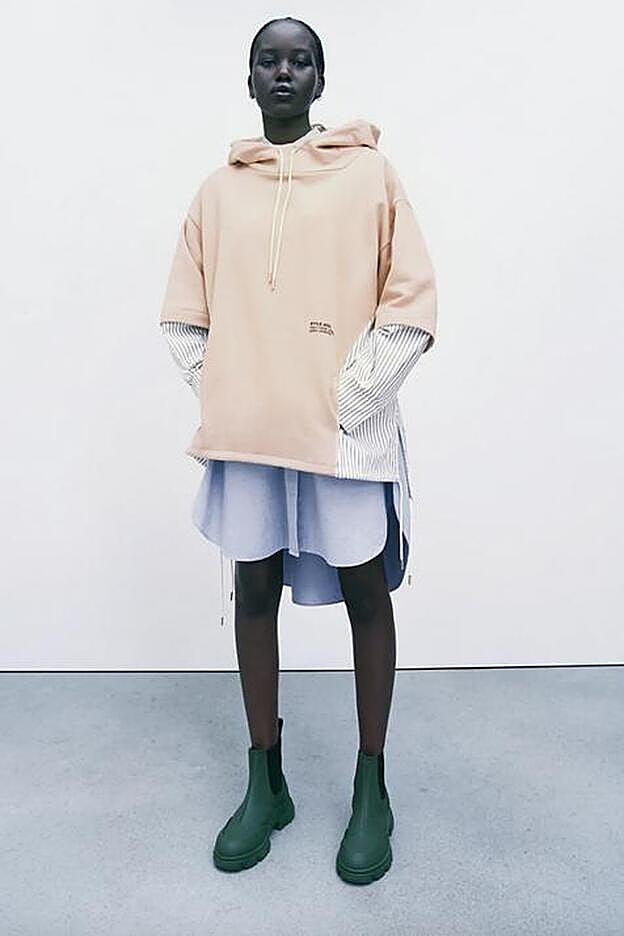 A medio camino entre una sudadera y una camisa de rayas, esta sudadera combinada de cuello redondo y manga larga con bajo asimétrico y detalle de pliegue en la espalda. Con el frontal blanco y la zona camisera en rayas blancas y negras, cuesta 22,95 euros y está disponible entre las tallas S y XL.