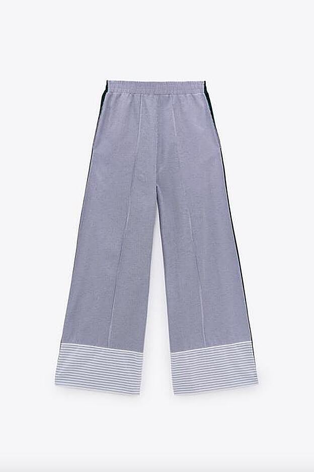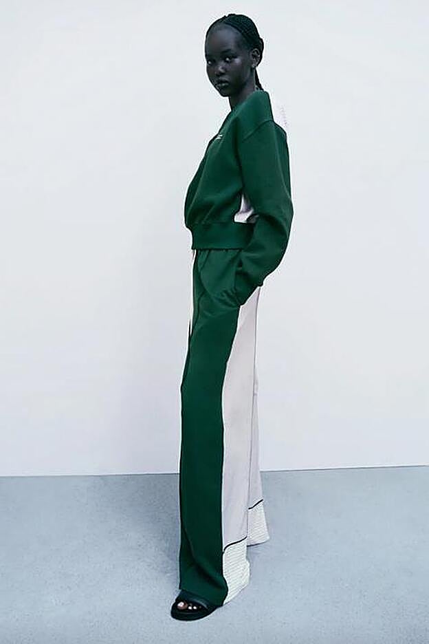 El pantalón en color verde botella, a juego con la sudadera, es de tiro alto y cintura elástica, con bolsillos laterales ocultos en costura, pernera ancha y tejido combinado a contraste en la espalda, con dos estampados de rayas diferentes en la pernera y el bajo. Cuesta 25,95 euros y está disponible en las tallas S, M y L.