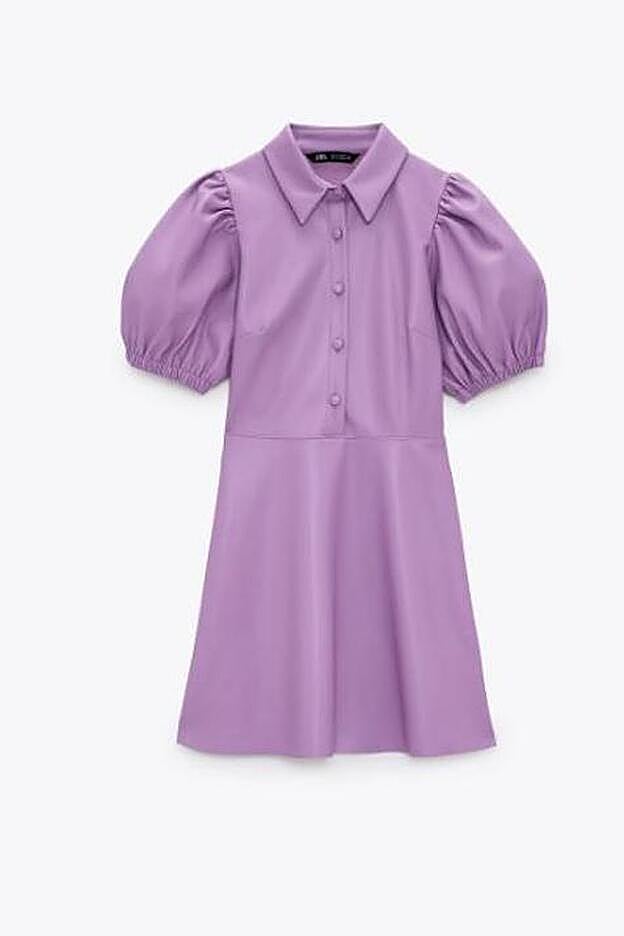 Se trata de un vestido que triunfó en su momento en Zara y se agotó volando. Es un diseño corto con falda de corte evasé, cuerpo camisero con cuello de solapas y cierre de botones y manga corta abullonada. Sin embargo, lo mejor es que es de tejido efecto piel, súper tendencia actualmente, y es en color lila, un tono que triunfó en 2020 y que parece que este año también viene pisando fuerte.