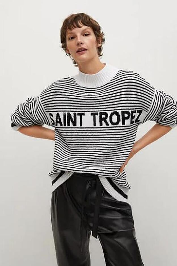 Se trata de un modelo con tejido con algodón y diseño largo y oversize con estampado de rayas en color blanco y negro con la palabra Saint Tropez en el frontal. Es de cuello alto, lleva la costura del hombro caída y las terminaciones del puño y el cuello acaban en contraste y en canalé. Cuesta 39,99 euros y está disponible desde la talla XS a la L.