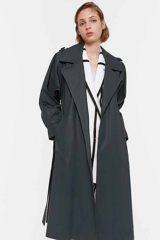 Como última propuesta te mostramos esta gabardina con efecto encerado en color petróleo que también podrás lucir gran parte del año. Con bolsillos laterales, cuenta con diseño cruzado cerrado mediante cinturón y tiene un precio rebajado de 119 euros.