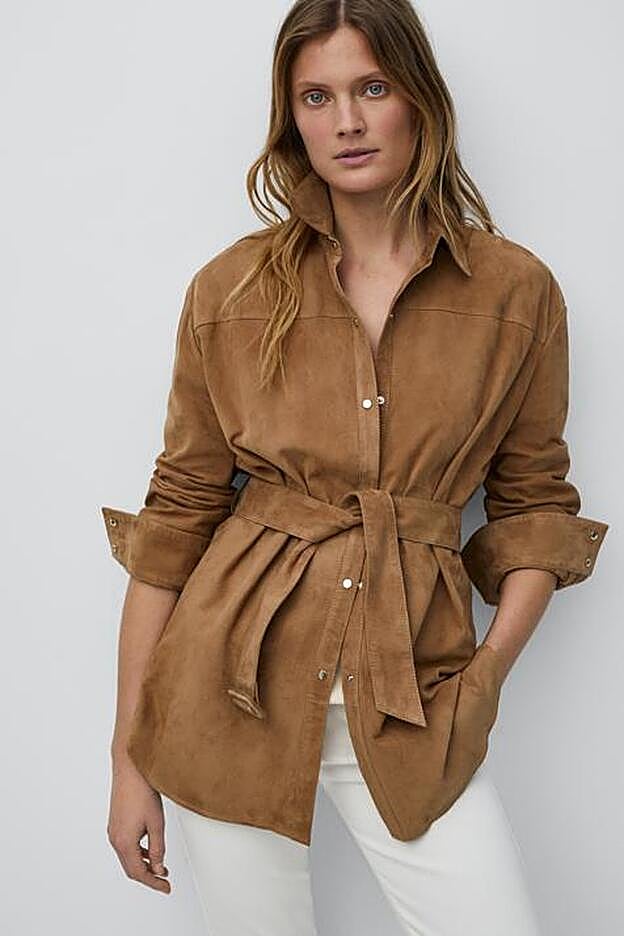 Por último, la versión más elegante de esta prenda es esta sobrecamisa de ante con cinturón a tono en beige confeccionada en piel ovina. Con cierre mediante botones tipo snap, cuello clásico, puños abotonados y bajo redondeado con aberturas laterales, podemos encontrarla en las tallas S, M y L por 249 euros.