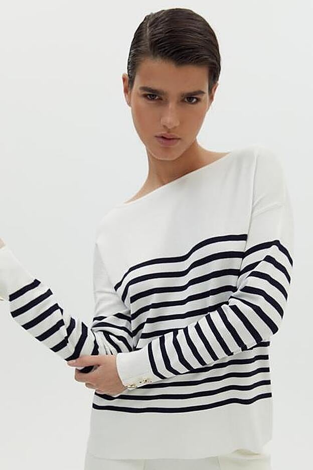 Tamara llevó un jersey en color blanco con finas rayas en azul marino, según hemos podido apreciar en las fotografías. Una prenda que es la absoluta protagonista de su look de calle y que ya hemos fichado entre lo nuevo de Sfera. Son muchas las firmas low cost que tienen a al venta jerséis y camisetas con este estampado, pero el de Sfera es idéntico al que ha llevado la marquesa de Griñón.