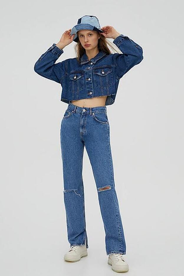 Nuestra primera opción es la chaqueta vaquera cropped. Corta, por encima del ombligo, con el bajo deshilachado, cierre de botones metalizados y costuras visibles. Un diseño que nos encanta para presumir de figura y para llevar con prendas de tiro alto. Será nuestra primera opción a la vuelta de los festivales... Cuesta 25,99 euros y está disponible en la web de la firma de Inditex desde la XS hasta la XL.