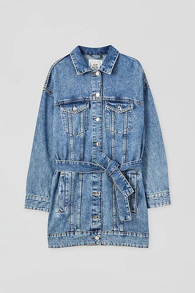 Seguimos con una cazadora denim mucho más versátil que la anterior, ya que su corte oversize te permitirá llevarla tanto en looks casual como para ir a la oficina toda la primavera. Es larga y lleva un cinturón para marcar la silueta si las formas XXL no te convencen. Nos gustan tanto para combinar con la tendencia del chándal como para sobreponerla sobre un vestido midi elegante. ¿Su precio? 35,99 euros.