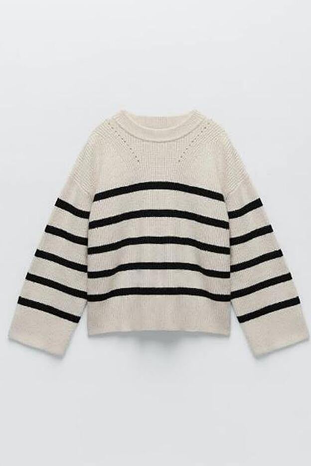 Albva la combinó con otra de las prendas estrella del momento y que está teniendo muchísimo éxito: un jersey de rayas marineras. En concreto escogió un modelo en color crudo con finas rayas en negro y mangas de corte ancho. Cuesta 29,95 euros y está disponible desde la talla S a la XL y sí, este sí que lo puedes copiar porque no está -todavía- agotado. Además, la influencer añadió unos jeans de corte flare en azul lavado y unas zapatillas. blancas.