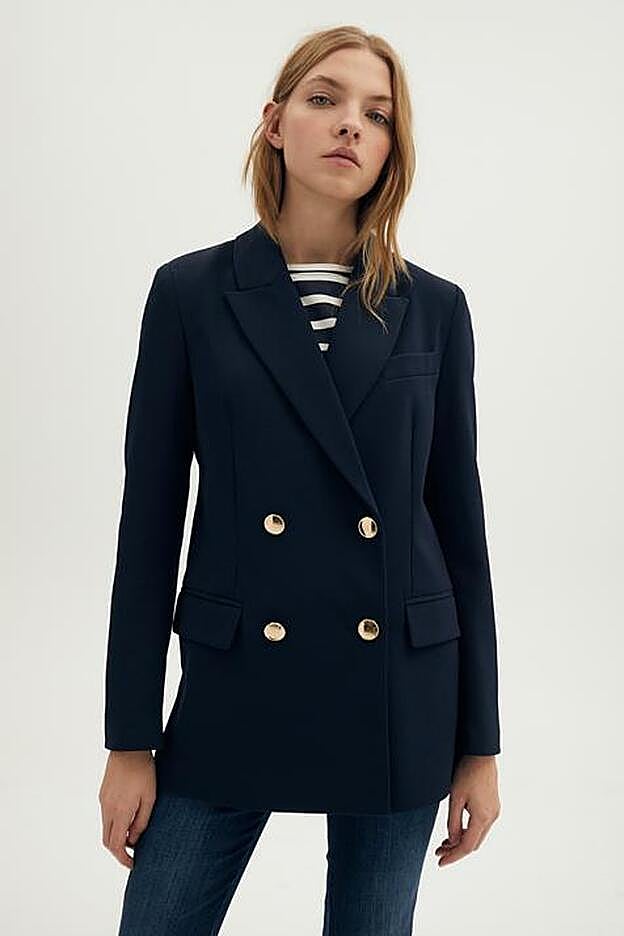 En blanco roto o en azul marino, la blazer básica de Sfera viene con solapas con muesca y bolsillos laterales con solapa.