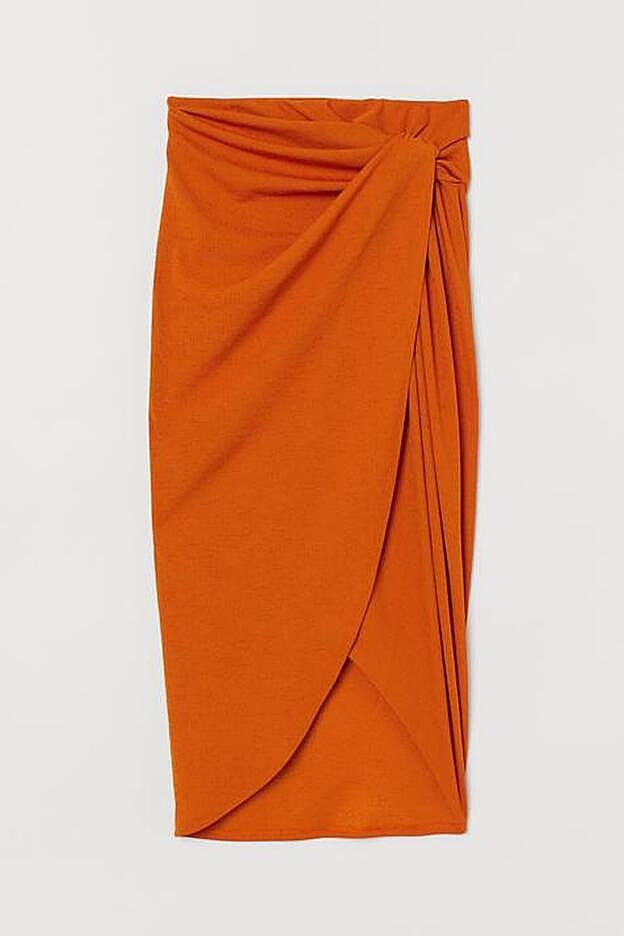 Terminamos con un modelo clásico para este tipo de faldas pareo, un diseño drapeado con nudo en un lateral y en los colores más bonitos y llamativos que acompañan a la subida de temperaturas. En este caso la hemos encontrado en un naranja saturado que nos vamos a poner para llevar de la oficina a la piscina este verano con zapatos de tacón, con mocasines, con sandalias, con sneakers... Encuéntrala en H&M por 20,99 euros. Eso sí, ha triunfado tanto que está agotada en todas las tallas y con lista de espera.