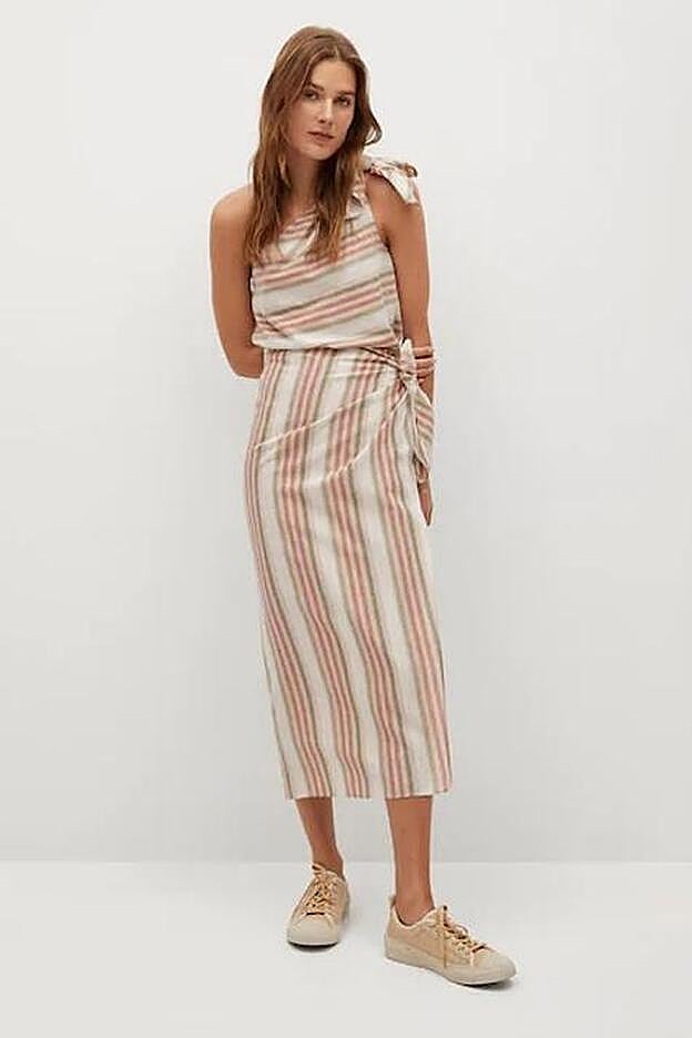 Seguimos con otra falda pareo pero en una versión mucho más veraniega que la anterior. Se trata de un modelo midi y cruzado en tejido de lino y con un estampado de rayas en tonos crudos que quedarán genial junto a tu bronceado y esas sandalias con hebillas que tienes en tu armario. Es de Mango, cuesta 29,99 euros y podrás combinarla con el top asimétrico a juego para un look de verano divino.