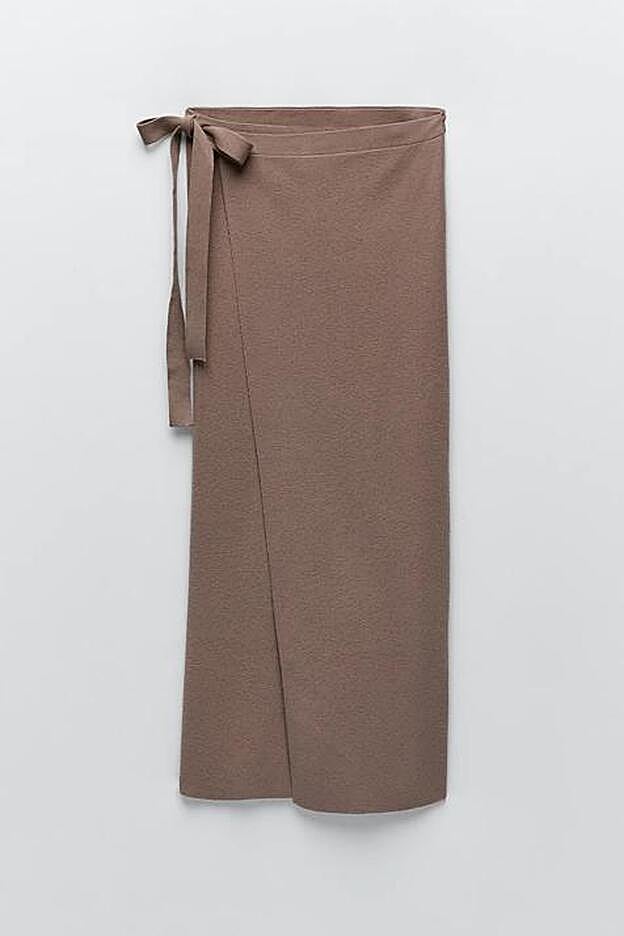 Nuestra primera opción la hemos encontrado en la nueva colección de Zara con un diseño que es perfecto para estrenar ya mismo y sacar partido hasta el final de la primavera. Esta falda pareo de punto será la mejor aliada en cualquier look de entretiempo y podrás combinarla tanto con botas y botines como sandalias o mocasines. Es de tiro alto, tiene un color rosa empolvado muy bonito y la cintura es ajustable, por lo quedará ideal en todas las figuras que tallen desde la S hasta la XL. Hazte con ella en la página web de la firma de Inditex por 25,95 euros.