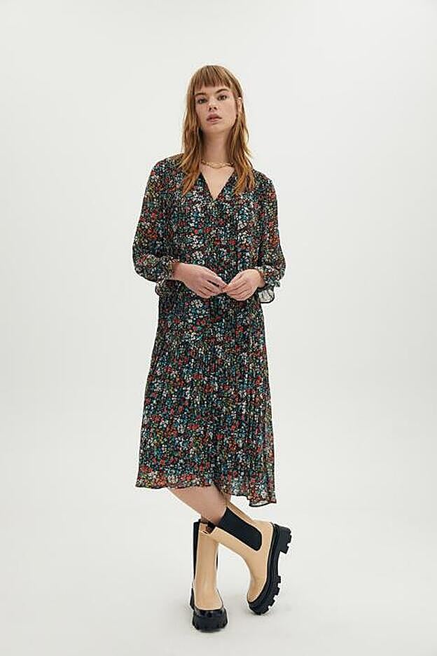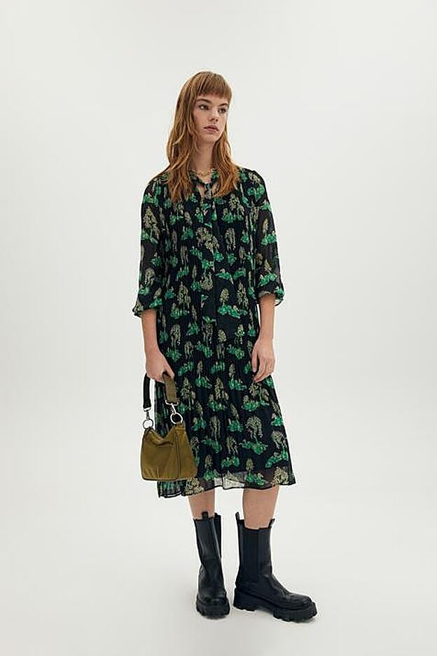 Se trata de un vestido de largo midi, corte recto y media manga que tiene un estampado floral ideal disponible en dos colores diferentes. El primero de ellos es uno para las fieles al color negro que prefieren seguir llevando tonos oscuros, pero que no reniegan de un poco de color. Es un vestido con fondo negro y flores en tonos verdes que lleva el tejido fluido plisado y el cuello con cierre de lazada. Cuesta 29,99 euros y de las tallas que han sacado, la L ya está agotada en la web de la firma.