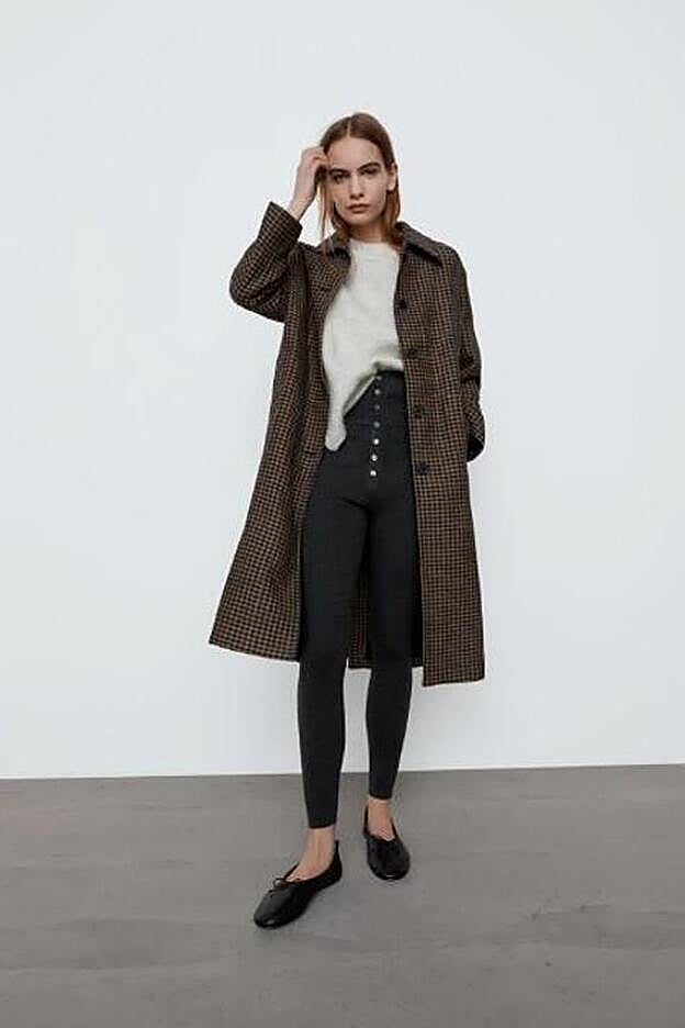 Se trata de unos leggins de punto en color gris oscuro que tienen como elemento característico un talle súper alto que llega casi hasta debajo del pecho y que va adornado con unos botones metálicos que consiguen un efecto corsé. Es decir, una prenda que define por completo la cintura y la cadera, estilizando al máximo esta zona del cuerpo gracias a un efecto óptico que se consigue con ese talle tan alto. Además, al ser de un tejido grueso es un leggin que apenas se marca y podrás llevar en tus looks del día a día. Cuestan 29,95 euros y están teniendo muchísimo éxito. De hecho, la talla S ya está agotada.