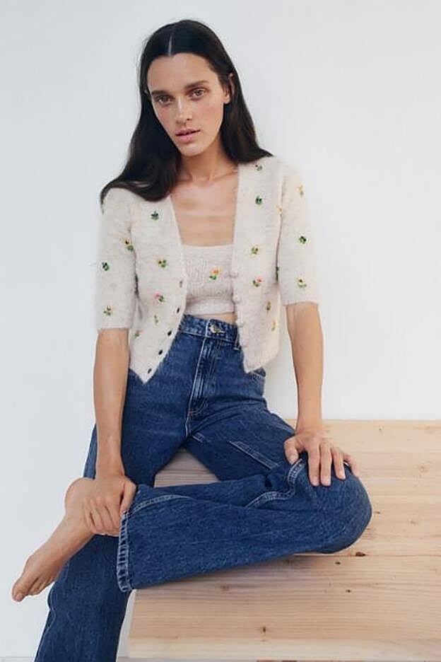 La chaqueta que luce hoy en sus redes sociales es de punto, escote de pico y manga corta, con detalles de abalorios bordados en forma de flor. La luce a conjunto con un top cropped con el mismo diseño, ambos de Zara, que puedes conseguir en su web por 12,99 la chaqueta y 5,99 el top (ambos rebajados).