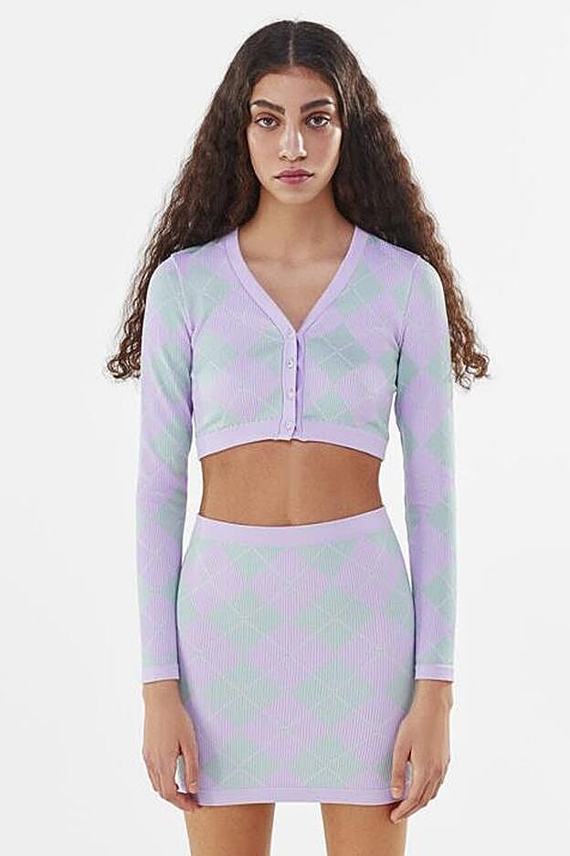 Si lo tuyo son las faldas mini tu conjunto es este compuesto por una falda mini y un cárdigan cropped en lila con estampado de rombos en color verde.