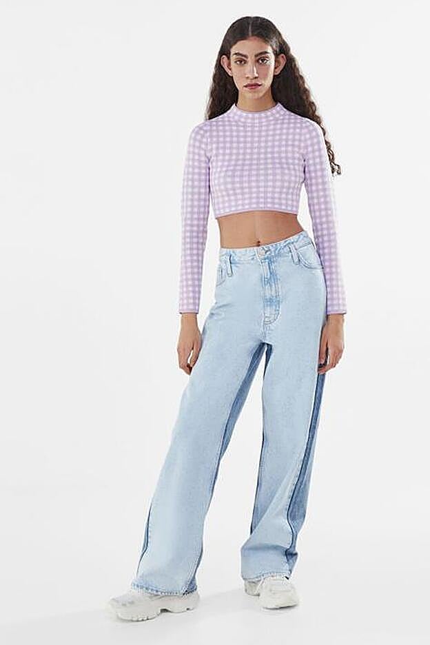 En la parte superior encontramos un jersey cropped con cuello perkins y mangas largas con el mismo estampado de cuadros. Tiene un precio de 15,99 euros y está disponible entre las tallas XS y L.