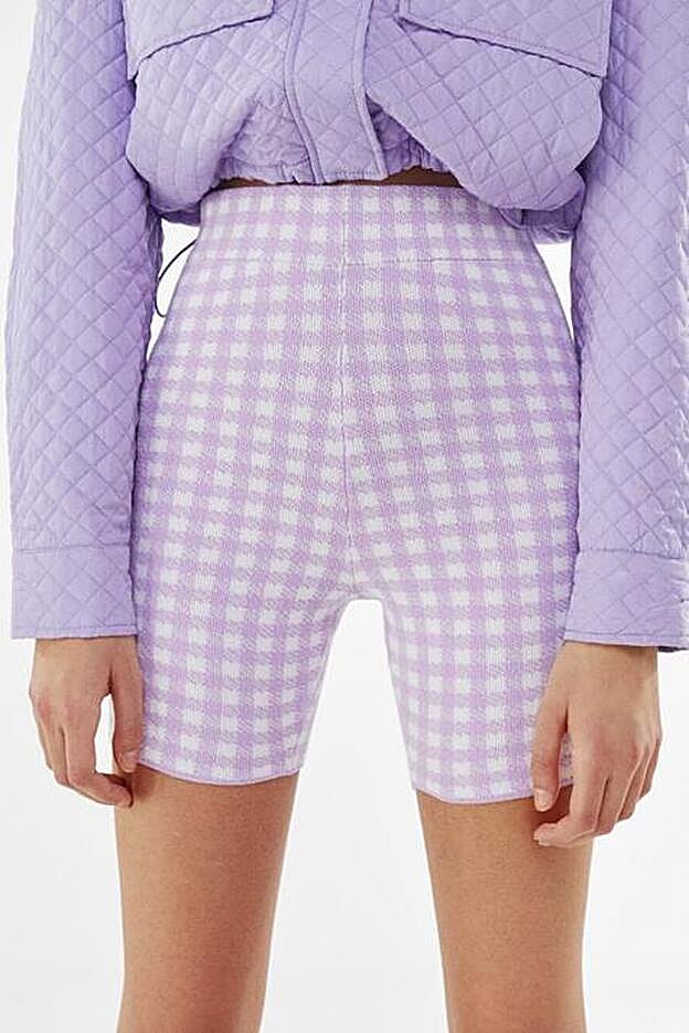 Si prefieres un pantalón Bershka sigue apostando por el diseño ciclista para este pantalón con estampado de cuadro vichy en lila y en blanco con cintura elástica. Cuesta 15,99 euros y podemos encontrarlo entre las tallas XS y L.